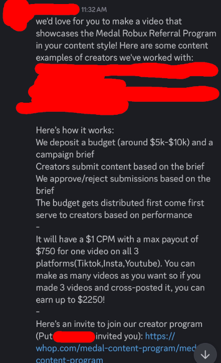 I wanted to ask if contacting directly via discord is a new way to reach out for it, it's not stated as such in the solutions article for the Content Creator program.https://support.medal.tv/support/solutions/articles/48001273965-medal-s-content-program-faqDue to it seeming fishy I rather make this post asking for clarification before telling him to do anything.(discord dm showed below, censored for privacy reasons)