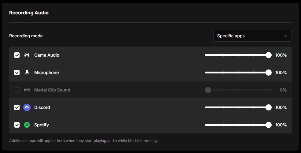 Under Medal's Settings > Audio > Recording Audio you are able to select either All PC Audio or Specific Apps.