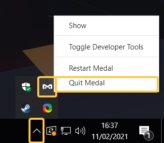 First, we need to shut down Medal. Go to the bottom right of your Taskbar, click on the ^ button, find the Medal Gold Icon, right-click it, and select Quit Medal.