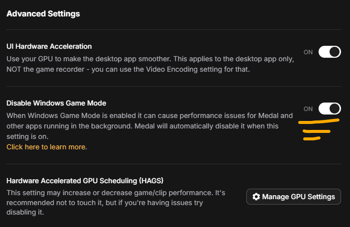 We have added a toggle within the Medal UI that automatically disables Window Game Mode to increase your clip performance. Don't worry though, if you're one of the few that prefers to have Game Mode on, you can also switch the toggle off to re-enable it.