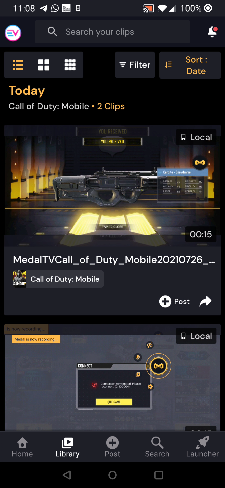 | When you finish recording, your clips will land on the library tab via Medal. | ![]() |