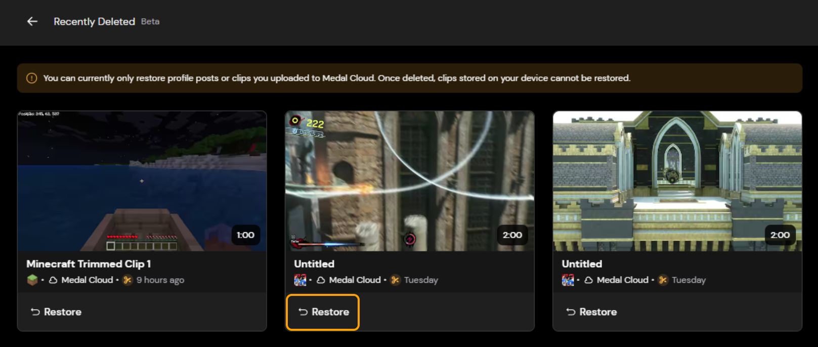 - Even after deleting a Clip that was Posted to your Profile or Synced to Medal Cloud, Medal will keep those Clips separated on an Album called Recently Deleted.