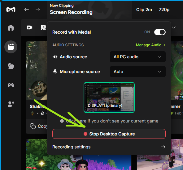 *To just record your game, simply open the game and Medal will start recording. Screen recording is good if you want to record non-game content or your game + other