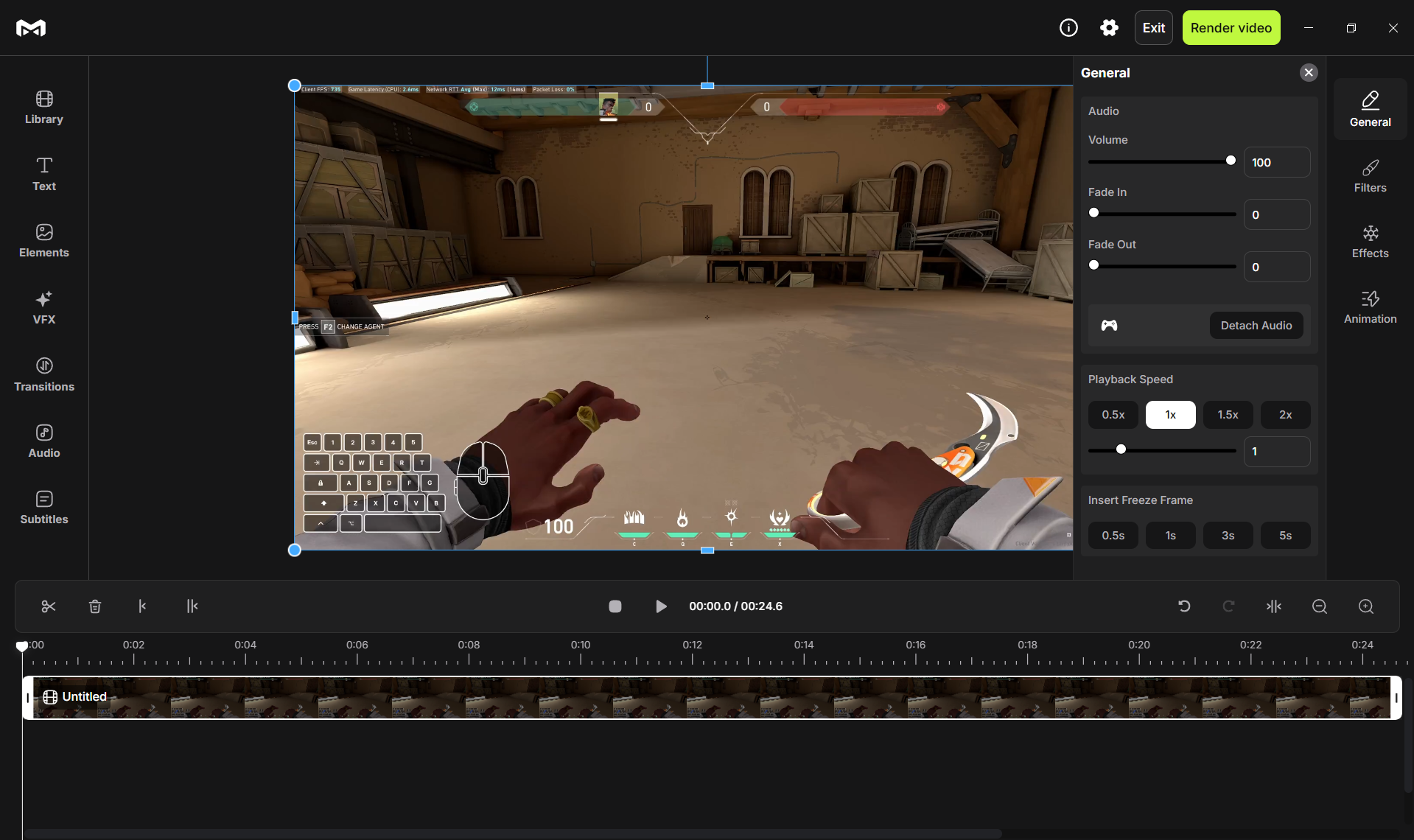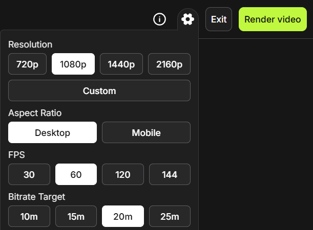 The Video Editor automatically adjusts its settings based on the largest clip you open, and will default to the settings you have set in Medal Settings > Quality. If you need different render settings, you can customize them at any time by clicking the Gear icon in the top-right corner. From there, you can configure everything you need for your final export, including resolution, aspect ratio, FPS, and bitrate target. Please adjust these settings according to your device’s capabilities. Keep in mind that higher-quality renders require Premium in order to be uploaded to your profile.